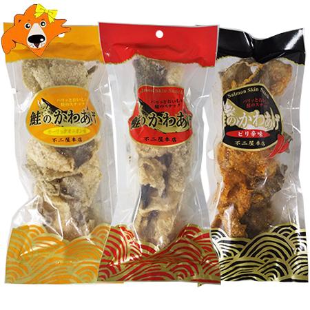 北海道 おつまみ 珍味 鮭のかわあげ 送料無料 鮭 かわあげ 珍味 鮭のスナック 塩味 / ピリ辛味 / ガーリックオニオン味 各1袋 計3袋 ちんみ 皮あげ 北海道産 鮭 / さけ / シャケ