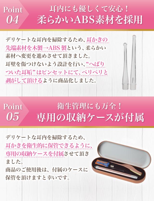 企画&設計では 耳かき や 子育て 全般に に詳しい【保育士&ベビーシッター】の先生からアドバイスをもらい、 子供用 の 耳垢掃除 や 定期的な 耳かき の 方法 など色々な使用方法を説明書として添えて企画&開発しました。