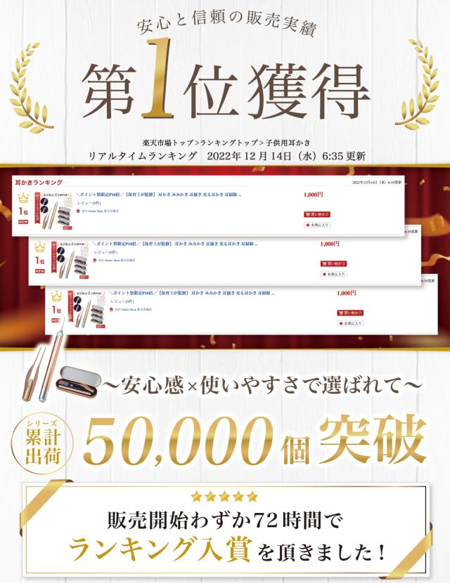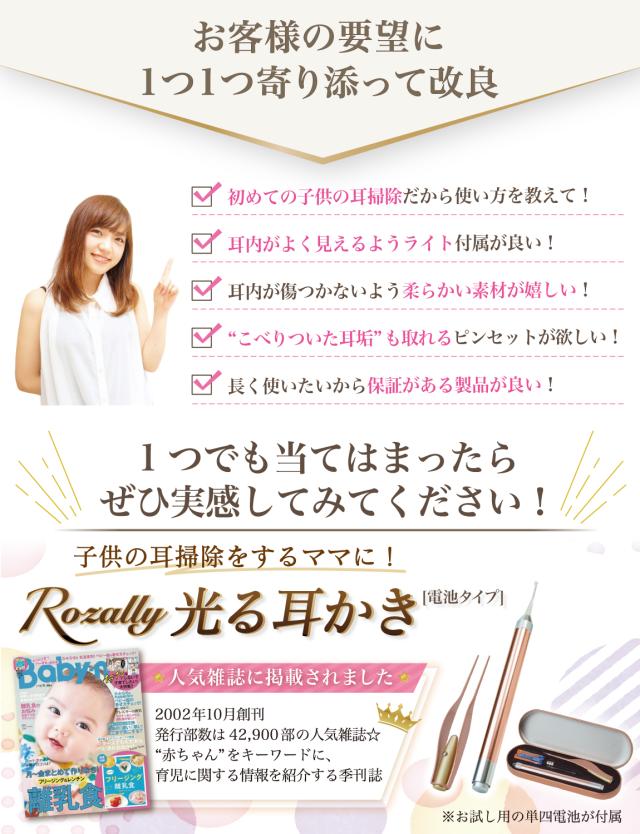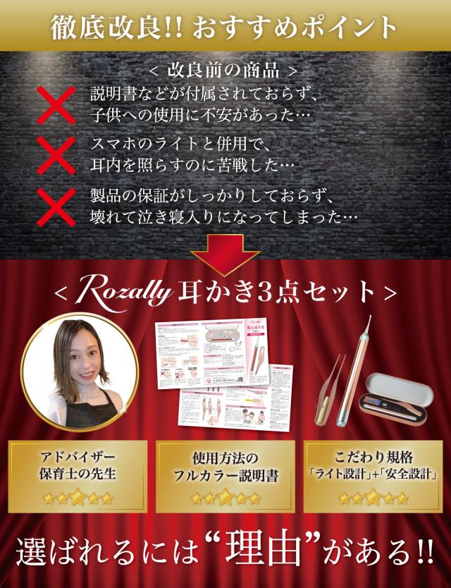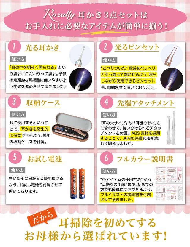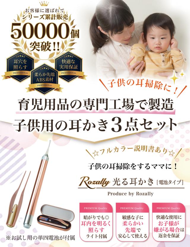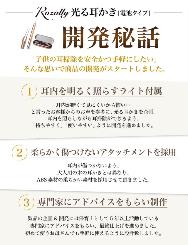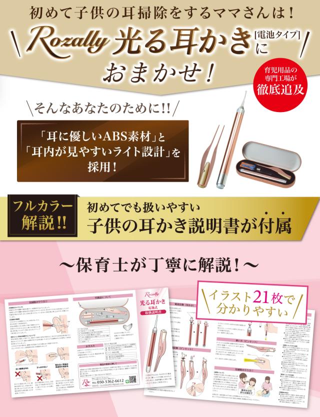 Rozally 耳かき セット 電池ver がついに正式販売開始。 子供 の 耳垢 掃除 のために みみかき と ピンセット が欲しい… というお客様に人気の “先端部が 光る耳かき ”です。 子供 や 赤ちゃん の 耳掃除 では耳穴が暗くて見えにくい… というお声が多く、照明付き の先端部が 光る 設計にすることで 耳 を ライト で照らして 耳掃除 がラクラクできる仕様に改良致しました。 企画&設計では 耳かき や 子育て 全般に に詳しい 【保育士&ベビーシッター】の先生からアドバイスをもらい、 子供用 の 耳垢掃除 や 定期的な 耳かき の 方法 など 色々な使用方法を説明書として添えて企画&開発しました。 |