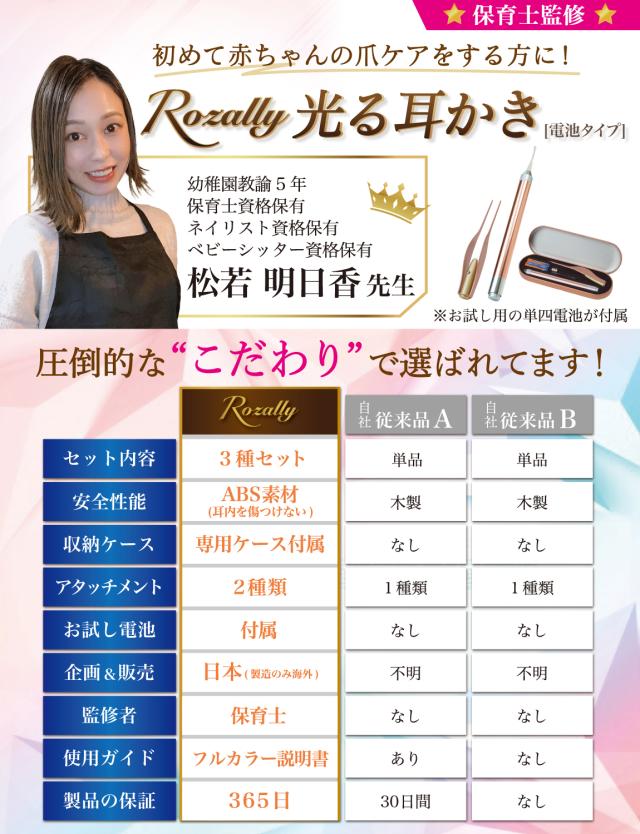 様々なメーカーから 子ども用 の みみかき 用品として ” 耳掃除セット ”や” 光る耳かき + ピンセット ”が販売されていますが、 Rozallyの 耳かき セット 電池ver は”こだわり”が一味違います。 照明付き耳かき や 照明付きピンセット など 育児&子育てアイテムをメインに取り扱っている 10社以上の工場からサンプルを取り寄せ、 「使いやすさ×安全性」を一緒に試行錯誤して頂けた1社に絞って発注を行なっています。 製造カラーについても かわいい 単色3カラーにて展開をさせて頂きました。 送料無料となっていますので、 「出産祝い」や「産後祝い」のプレゼントなどにもご愛用頂いております。 |