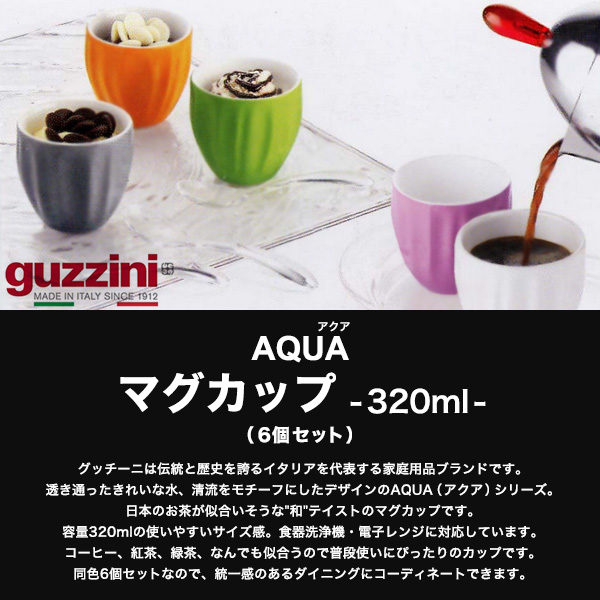 マグカップ 6個セット guzzini AQUA おしゃれ バイカラー 320ml 和テイスト コーヒーカップ 食洗機対応 洋風 湯のみ ティーカップ 茶器 可愛い 食器 イタリア製 ホームパーティー 洋食器 グッチーニ 卓上用品 テーブルウェア 誕生日会 お食事会 飲み会