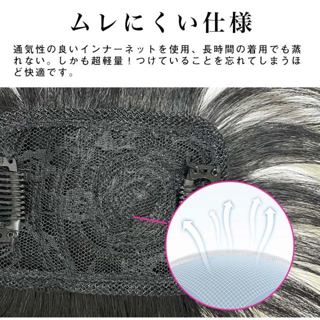 ※このヘアピースは人毛で、手作りのため、他のカラーの糸と白髪が混ざっている場合がございます。予めご了承下ださい。