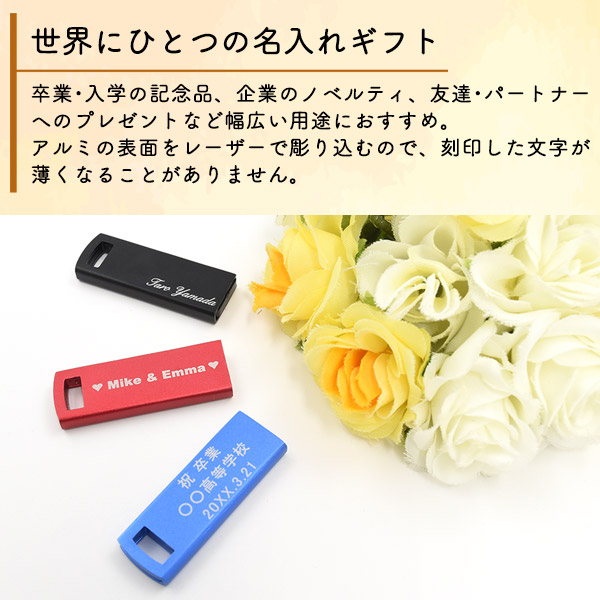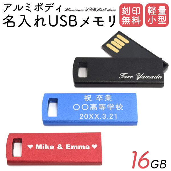 名入れ 刻印無料! 16GB アルミボディ USBメモリ 赤 青 黒 3色展開 ギフト 記念品 卒業祝い 就職祝 入学祝 USBメモリー ストラップホール付き アルミ製 コンパクト 薄型 スリム スマート 光沢 メタリックボディ 送料無料