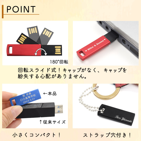 刻印 刻印サービス 刻印無料 無料刻印 名入れサービス お名前刻印 名入れ無料 USBメモリー USBメモリ スタイリッシュ コンパクト 薄型 小型 キャップレス 回転式 スリム 薄い 記念日 卒業記念品 卒業祝い 入学祝 入学お祝い品 新生活 学生 新社会人 就職祝い お祝い プチギフト お手軽 ギフト 贈り物 プレゼント オリジナルグッズ 誕生日 ノベルティ 赤色 黒色 青色 レッド ブルー ブラック アルミ製 アルミボディ レーザー刻印 おしゃれ かわいい うれしい 小学生 中学生 高校生 大学生 クラス会 サークル クラブ 部活動
