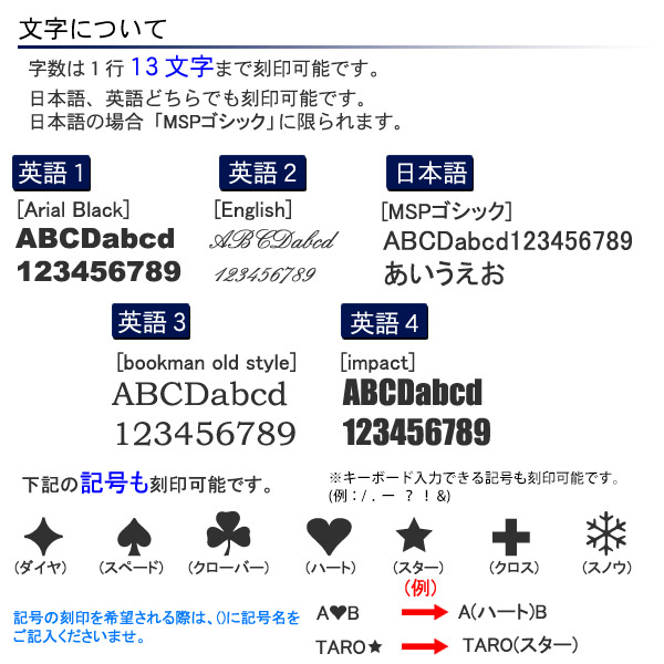 ■刻印可能文字 【1行につき13文字まで、3行まで刻印可能】
