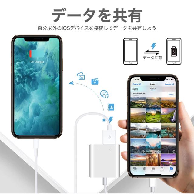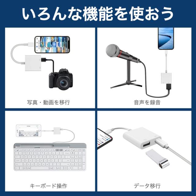 | USBアダプタ | ●【Lightning USB カメラアダプタ】Lightning USB カメラアダプタを使って、PCやAPPなどは不要で、12MB/S~16MB/Sの高転送速度でカメラから写真やビデオをiPhone、iPadに転送することができます。 「MIDIキーボード、PCキーボード、ハブ、電子ピアノ、電子ドラム、USBヘッドセット」※500mA未満を超える機器(HDD等)での使用はできません。 【高速転送】12MB/S~16MB/Sの転送速度で、WIFIやPCを経由するよりも速くデータ転送できます。短時間で思い出が溢れる写真・ビデオを家族、友達にシェアできます。カメラのWIFIを使用するよりも時間が節約できて、途切れることなく安定に転送できます。 【プラグ&プレイ】iPhone/iPadに挿入するだけで、手軽に写真・ビデオを転送できます。PCを経由しなくても、RAWで撮影した写真をiPhoneに取り込めます。 ※注意:USBカードリーダーから写真やビデオを読み込む時は、「DCIM」ファルタを作成する必要があります。 ※USBメモリの読み込み、保存等は、 [iOS13以降] にアップデートする必要があります。 |