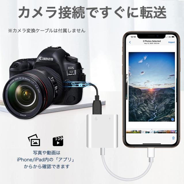 【Lightning USB カメラアダプタ】Lightning USB カメラアダプタを使って、PCやAPPなどは不要で、12MB/S~16MB/Sの高転送速度でカメラから写真やビデオをiPhone、iPadに転送することができます。※USBメモリの読み込み、保存等は、 [iOS13以降] にアップデートする必要があります。保証期間 ●初期不良のみ注意●USBメモリの読み込み、保存等は、 [iOS13以降] にアップデートする必要があります。●本製品を使用中にデータの損失、破損が生じた場合の保証は致し兼ねますので予めご了承ください。●本製品を使用した事による、直接的もしくは間接的に生じた損害・破損(データを含む)については弊社では責任を負いかねます。