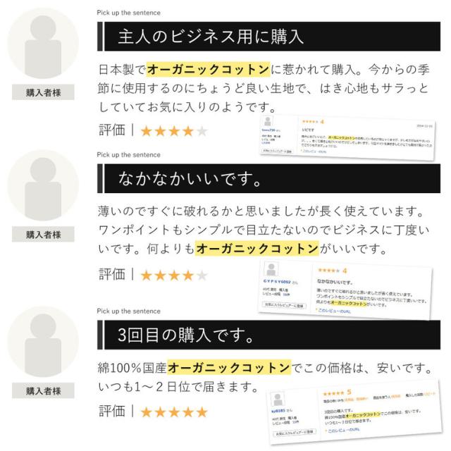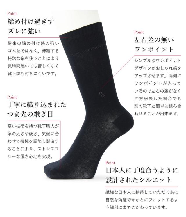 安心の素材と靴下の匠の技で作り上げました。 海外産でお手ごろな価格のものが溢れる中、素材や品質がちょっぴり気になるトコロ。そんなあなたにこそぜひ試して頂きたい。 国内一の靴下生産の街、奈良県広陵町で生まれたビジネスソックスです。 オーガニックコットンを使用しているのでお子様やお肌の弱い方にも喜ばれています。 裏糸には消臭加工糸を使用することで気になる臭いを解消してくれます。蒸れやすい季節にも最適の靴下です。 つま先とかかとを補強することにより長くお使いいただけるようになりました。 細部にまでこだわりぬいた日本製のビジネスソックスを是非お試しください。 【スーツに最適な丈】 座っていても、脚を組んでも裾から肌を見えない理想的な丈を追求しました。日本人に合わせて設計されたサイズ感はズレやずり落ちを防止します。 【ギフトにもピッタリ】 誕生日や父の日、クリスマスやバレンタインなど、ちょっとしたお返しとしても日本製のソックスは最適です。何足あっても困らない実用的なプレゼントとして嬉しい靴下です。 |