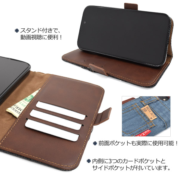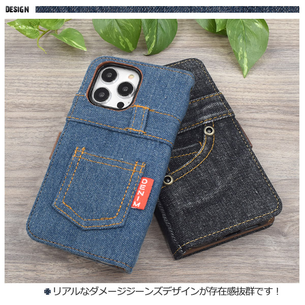 | 衝撃やキズなどからスマホを守ります。 内部ケースはソフトケースのため、着脱が簡単です。 リアルなダメージジーンズデザインが存在感抜群! 内側は落ち着いたレザーデザインです。 背面を折り返すとスタンドとして使用でき、動画視聴に便利です。 落下防止に便利なストラップホール付きです。 開閉が簡単な上下式マグネットフラップを採用! 閉じるだけでしっかりとケースを固定できます。 横開きタイプなので、手帳のように使うことができます。 また、内側に3つのカードポケットとサイドポケット付きです。 | ||||||||||||||