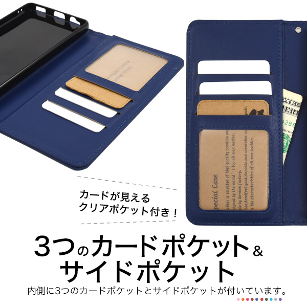 | 衝撃やキズなどから守ります。 また、内部はソフトケースなので着脱が簡単です。 背面を折り返すとスタンドとして使用できるので、動画視聴に便利です。 落下防止に最適なストラップとストラップホール付きです。 横開きタイプなので、手帳のように使うことができます。 また、内側に3つのカードポケットとサイドポケットが付いています。 | ||||||||||||||