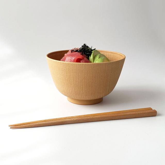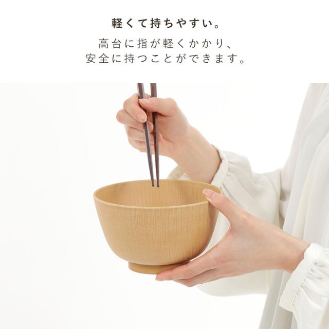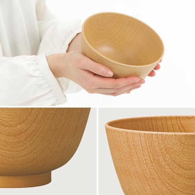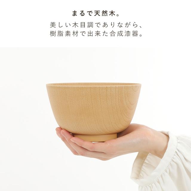 ナチュラルな天然木のような汁椀。家庭用電子レンジ、食器洗い乾燥機対応の合成漆器です。