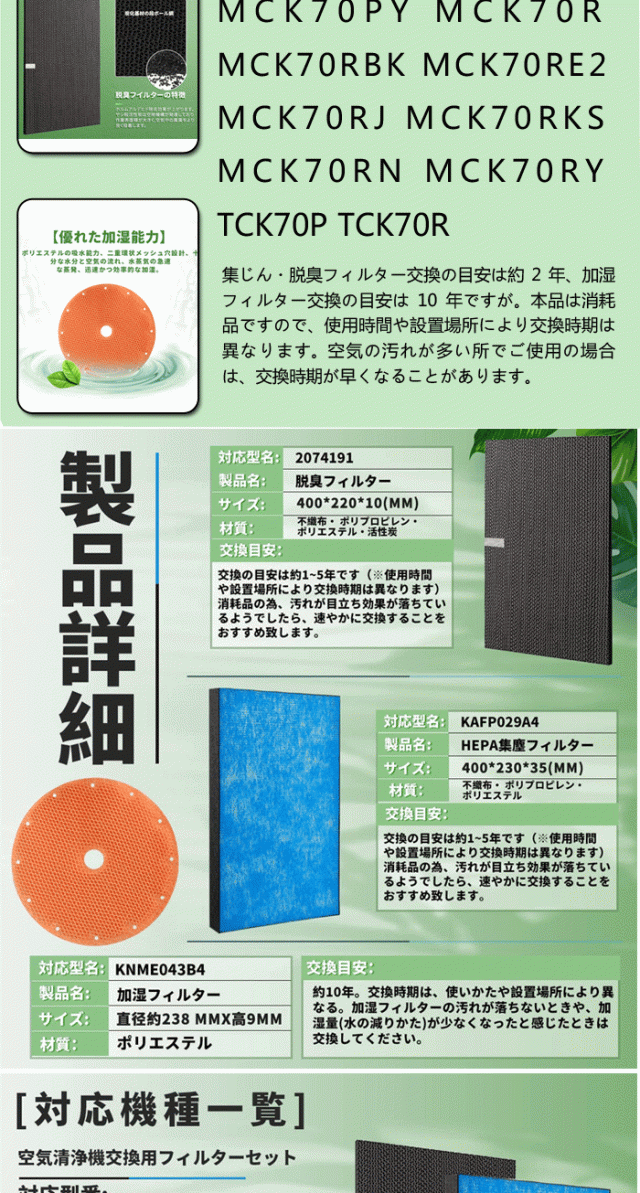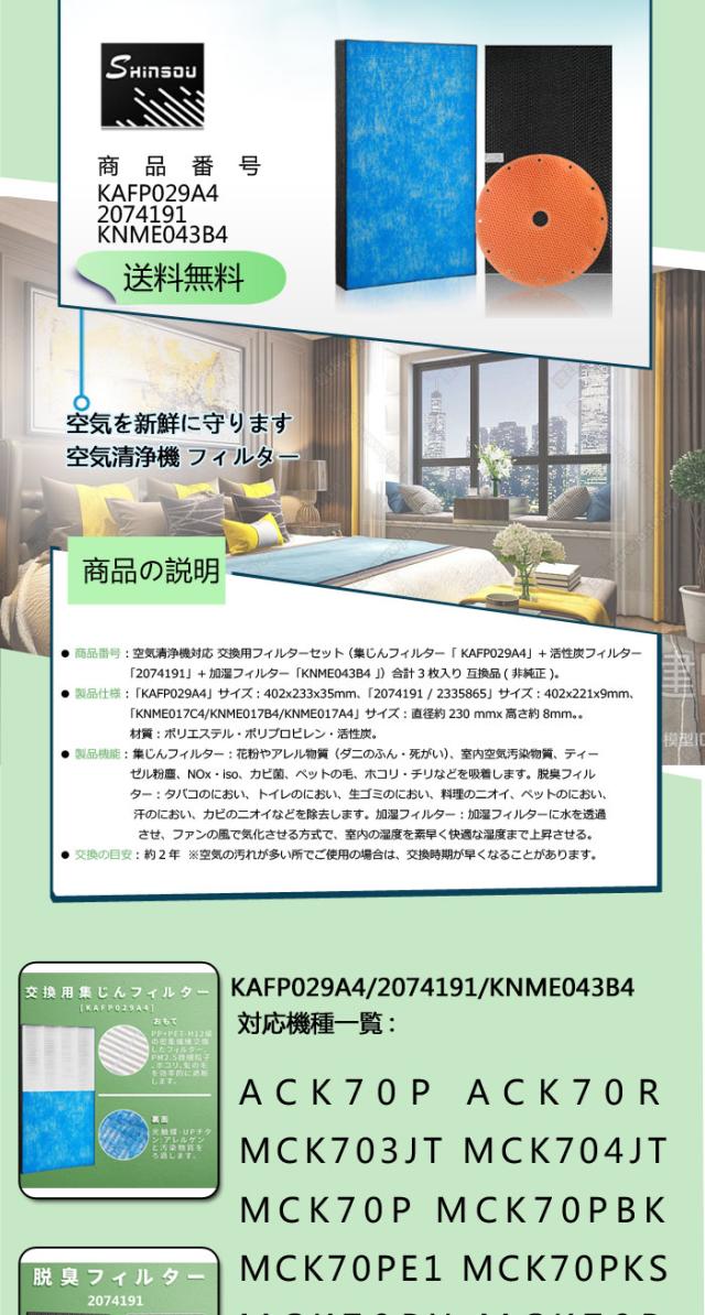 空気清浄機対応 交換用フィルターセット (集じんフィルター「 KAFP029A4」+活性炭フィルター「2074191」+加湿フィルター「KNME043B4 」)合計3枚入り 互換品(非純正)。 |