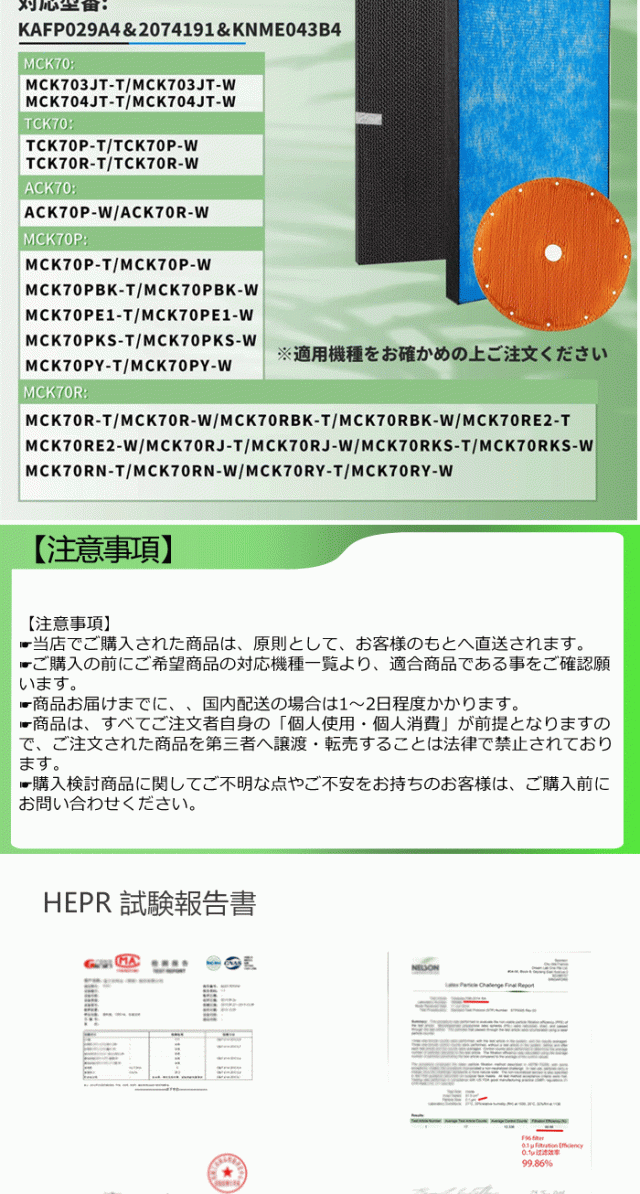 ● フィルター 機能: 集じんフィルター:花粉やアレル物質(ダニのふん・死がい)、室内空気汚染物質、ティーゼル粉塵、NOx・iso、カビ菌、ペットの毛、ホコリ・チリなどを吸着します。脱臭フィルター:タバコのにおい、トイレのにおい、生ゴミのにおい、料理のニオイ、ペットのにおい、汗のにおい、カビのニオイなどを除去します。加湿フィルター:加湿フィルターに水を透過させ、ファンの風で気化させる方式で、室内の湿度を素早く快適な湿度まで上昇させる。