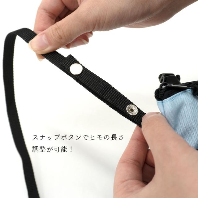 ショルダーは強く引っ張られると外れる安全機能付き。スナップボタンで長さ調節も可能です。