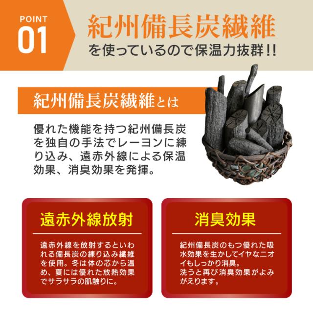 遠赤外線を放出するといわれる備長炭の効果で、冬は体の芯から温め、夏には優れた放熱効果でサラサラの手触りに。