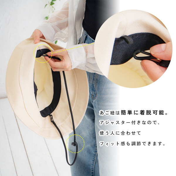 ”風の強い日でも安心。あご紐付き”