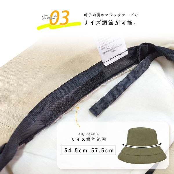 帽子内側のマジックテープで、簡単にサイズ調整が出来かねます。 サイズ許容範囲は 54.5cm〜57.5cm です。