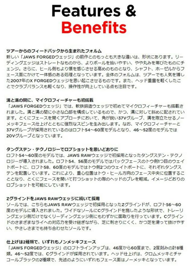 また、JAWSRAWでシリーズの代名詞となったノーメッキ仕上げのフェースには、37Vグルーブ(ロフト56〜60度)に加えて、軟鉄鍛造ウェッジでは初めてマイクロフィーチャーも搭載(ロフト56〜60度)。心地良い打感とともに、従来以上のスピン性能も持ち合わせています。
