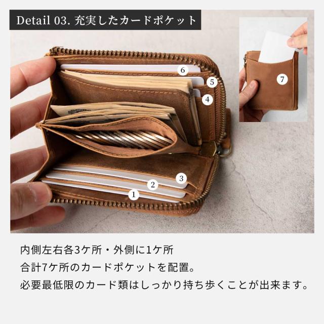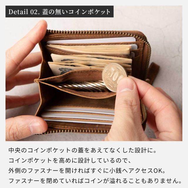 ファスナーのないコインケース、お札を仕切りで収納、外側のカードポケットなど、使いやすさのこだわりが詰まっています。