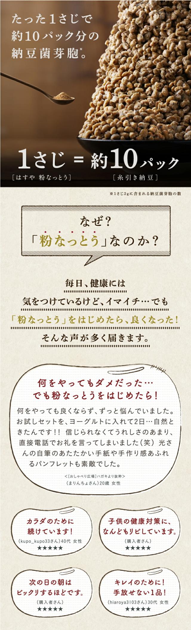 粉なっとう[あらびき]小さじ1杯2gに10パック分の納豆菌が生きてます。 生きた納豆菌が腸まで届くプロバイオティクス!人気に訳あり!納豆菌の質と量が圧倒的に違うから口コミで人気。ポリアミンやナットウキナーゼ(納豆キナーゼ)も含む健康食品(サプリメント)ランキング1位(ダイエット・健康部門)メール便対応可。納豆粉末/乾燥納豆と検索されたりします。
