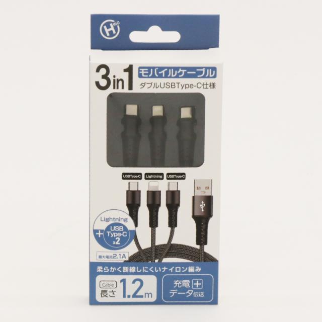 NEW 3in1モバイルケーブル ダブルUSB Type-C×2×2 Lightning×1 HDL-CCL01 3in1 iPhone ケーブル USBケーブル Android Type-C用 急速充電ケーブル 高耐久ナイロン モバイルバッテリー 充電器 車内 タブレット iPad 旅行 外出先 マルチケーブル 充電 データ転送