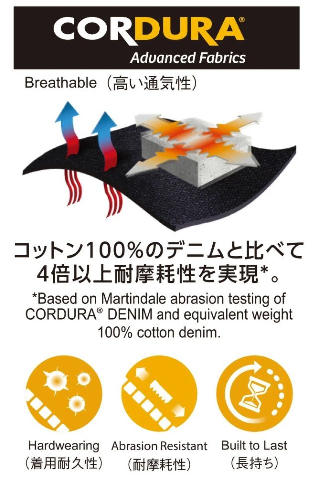 | 素材 | CORDURA(コーデュラ)アメイジングストレッチデニム(綿65%・ポリエステル19%・ナイロン14%・ポリウレタン2%) | ||||||