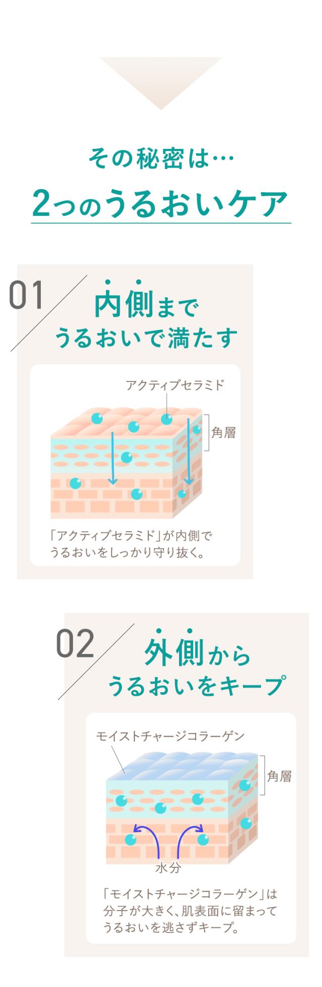 やわらかなとろみのある化粧液が肌に浸透し、独自のWうるおいアプローチでうるおいキメ肌に導きます。