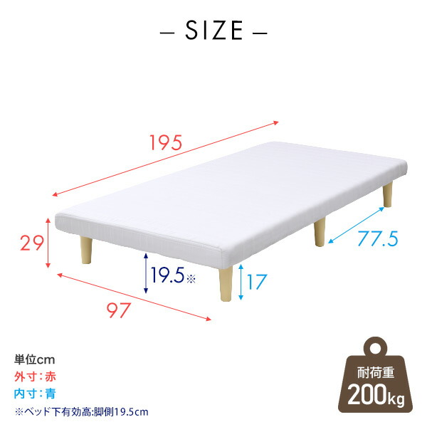 | 商品説明 | ●かため(187N)のウレタンフォームを使ったマットレスタイプ ●圧縮梱包で小さく梱包されたマットレス ●ベッド下有効高:側面17cm、脚側19.5cm ●静止耐荷重:200kg(保証値ではございません。) 本製品は7000N(700kg相当)の荷重試験をクリアした商品です。 当社では安全を考慮し、本商品は耐荷重200kgに設定しております。 ●【実用新案】取得済みの独自構造で耐荷重も安心 ●マット厚:9cm ●プラ脚直径:6.5cm ●脚から脚まで幅77.5cm ●マットレスの張地は滑らかなポリエステル素材を使用 ●本体内蔵の木枠と、後付の補強枠・脚を取り付けて完成 ※圧縮梱包で玄関先までお届け、開封後約1日で復元します。(環境により時間が前後します。) ※2023年12月 1日より耐荷重表記について見直しを行いました。 |