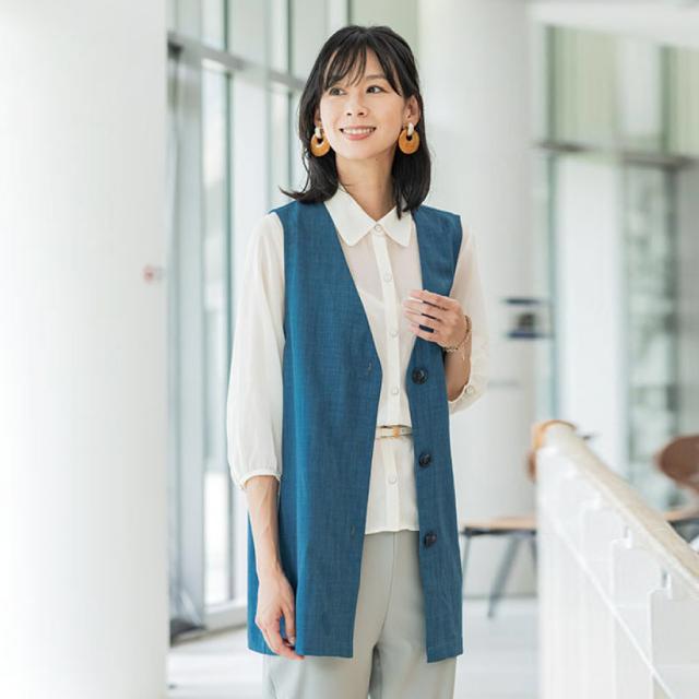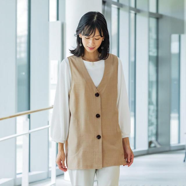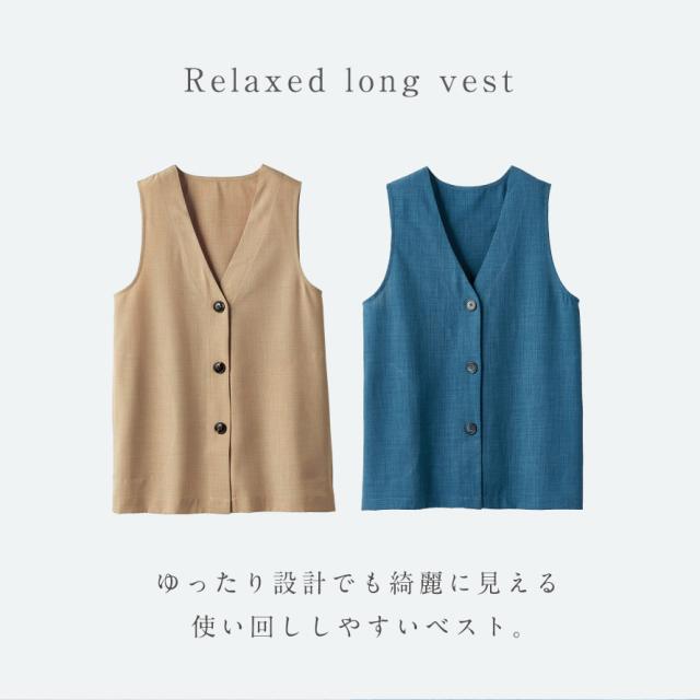 ゆったり設計でも綺麗に見える!杢調の生地で使い回ししやすいロングベスト。