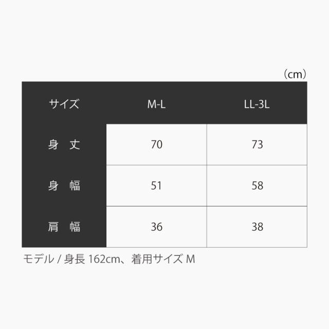 ■サイズ:M-L/身丈70、身幅51、肩幅36、LL-3L/身丈73、身幅58、肩幅38cm。モデル/身長162cm、着用サイズM。