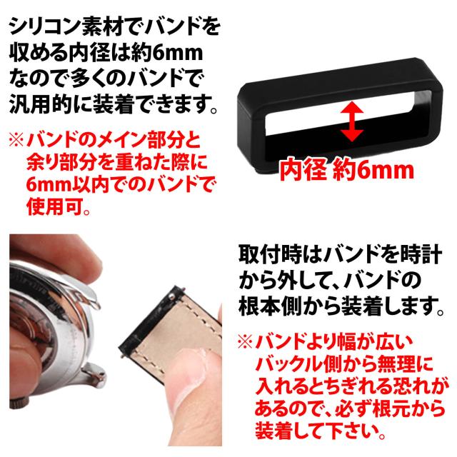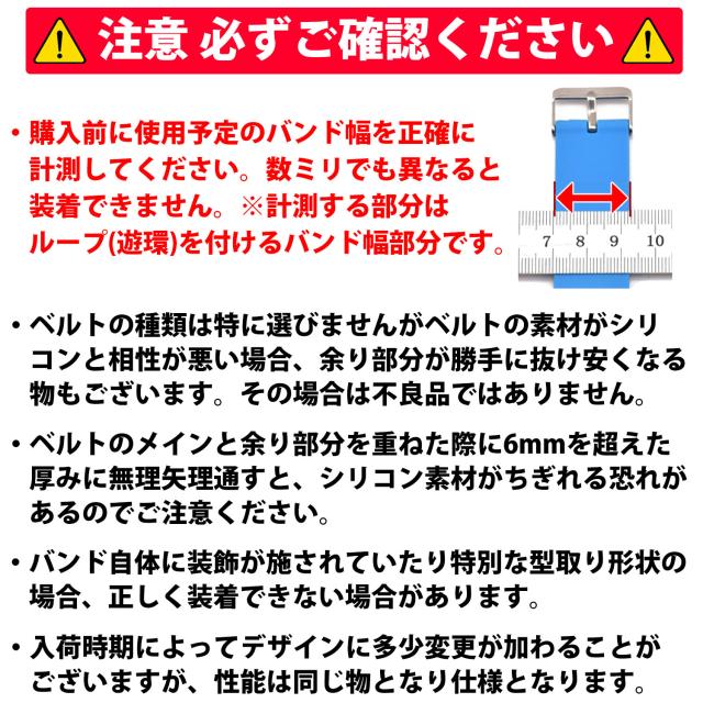 ・ベルトのメインと余り部分を重ねた際に6mmを超えた厚みに無理矢理通すと、シリコン素材がちぎれる恐れがあるのでご注意ください。