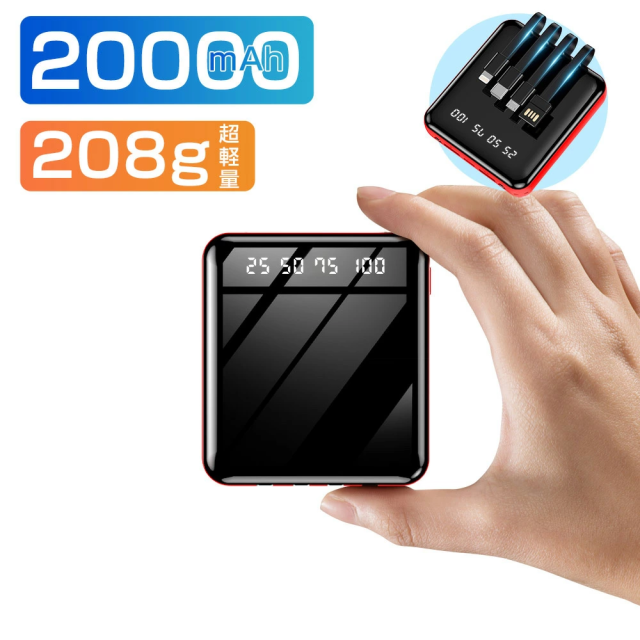 【新登場 4ケーブル内蔵】 モバイルバッテリー 大容量 20000mAh 急速充電 携帯充電器 ケーブル内蔵 Lightning type-c micro usb LEDライト付 スマホ充電器 超小型 軽量 5台同時充電 iphone 充電器 懐中電灯 旅行 出張 停電対策 災害 iPhone/Android各種対応