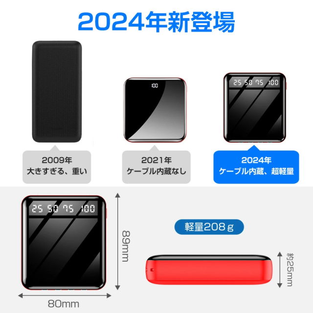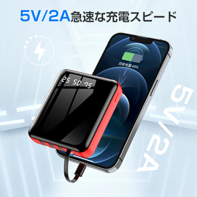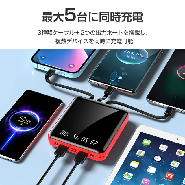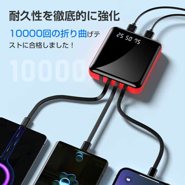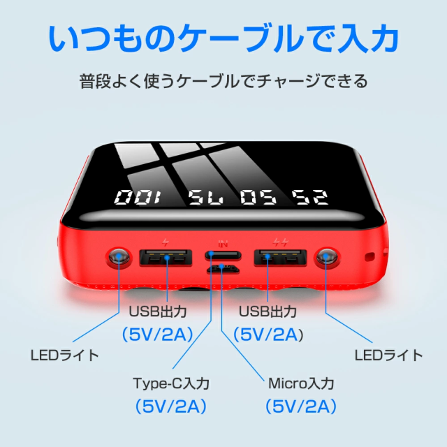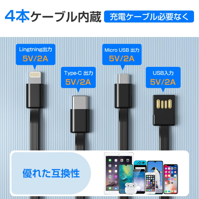 出力:Lightningケーブル/Type-cケーブル/Micro-USBケーブル/2点USBポート