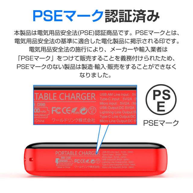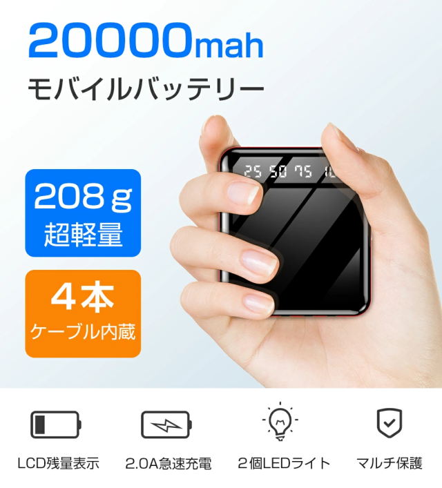1x 20000mAh モバイルバッテリー本体 1x Type-c ケーブル 1x 取扱説明書(日本語)