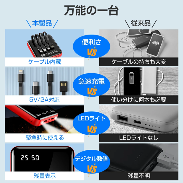 - ケーブル内蔵で、専用ケーブルを持ち歩く必要がなくとても便利で買って良かったです。