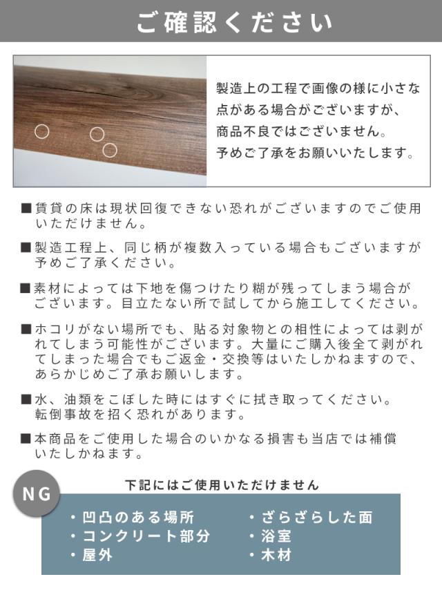 ◆シートの貼り方・簡単3STEP 予め、事前に貼る場所をきれいに乾拭きし、ホコリや汚れを取り除いた状態で作業してください。 1.)貼りたい場所を測定し、少し長めにカットします。 2.)台紙を少し剥がし、予め裏面の保護シートに折り目をつけておきます。 3.)貼り付ける箇所に合わせ、上部から少しづつ空気を押し出すように貼っていきます。(中心から外側に空気を押し出すように) ※最後に余った部分を定規などを押し当てながらカットして整えてください。刃物の取り扱いには十分ご注意ください。 ◆以下の場所にはオススメできません ・凹凸のある面や、すりガラス、ザラザラとした質感の壁等 ・障子や和紙などの柔らかい素材の面 ・塗料を施した素材 ◆ご使用上の注意点 ・スキージー、ハサミやカッター、定規などは予め用意してから作業してください。 ◆下記、必ずご確認ください ・古くなった壁紙や、エンボス生地の柔らかい壁紙の上から貼った場合、剥がすときに下地の壁紙がくっついてしまう場合がございます。必ず目立たない場所で試してからのご利用をおすすめいたします。 ・本商品は、ホコリや湿気の多い場所、直射日光などの状況により、剥がれてくる場合がございます。 ・貼る対象物のホコリや汚れをきれいに取り除いてから施工してください。(剥がれの原因になります) ・ホコリ等がない場合でも、貼る対象物との相性によっては、剥がれてしまう場合がございます。大量にご購入後、全て剥がれてしまった場合でも、当店にて返金・交換等は致しかねますので、予め少量でお試しいただくことをオススメ致します。 ・生産ロットが違う場合、柄・色味が若干変わってくる場合がございます。再度ご購入の場合、色・柄合わせができない場合がございますのでご注意ください。 ・本商品をご使用した場合のいかなる損害も当店では補償致しかねます。 |