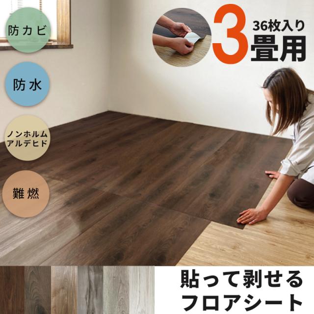 フロアシート フロアシール 貼るだけ 3畳 36枚入り シール式 フロアーマット 剥せる 木目調 ウッドタイル 傷防止 床保護 防カビ 防水 難燃