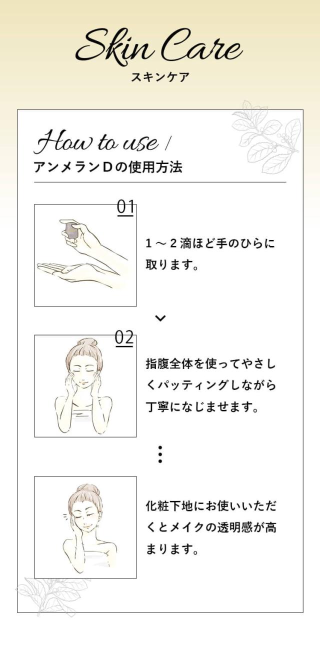 | 使用方法 | 1〜2滴ほどを手のひらに取り、指腹全体を使ってやさしくパッティングしながら丁寧になじませてください。 ※化粧下地にお使いいただくとメイクの透明感が高まります。 |