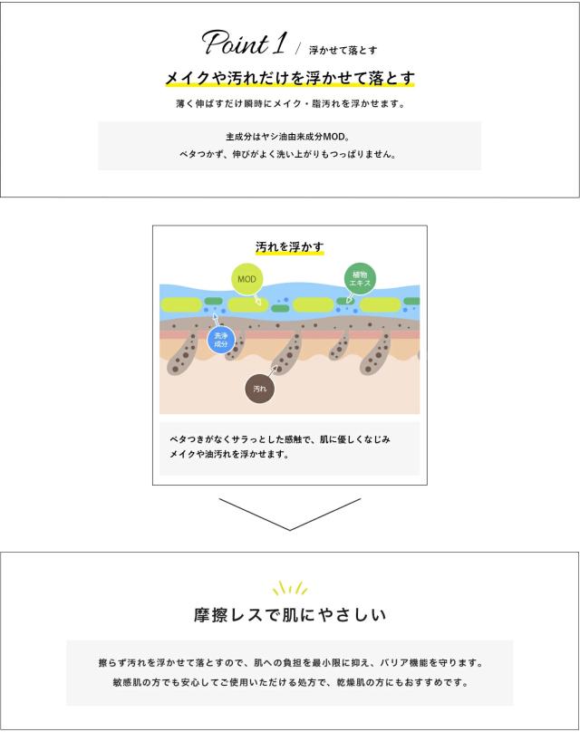 顔全体になじませるだけで、やさしくメイクや汚れを落とせます。オールスキン対応で敏感肌の方も使いやすく、肌に負担をかけずに毎日のスキンケアが可能です。