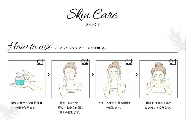| 商品特徴 | 6種の植物エキスを配合したオールスキンタイプ。 肌にやわらかく伸びて、汚れだけを素早く浮かせ、うるおいはそのままに。 こすらず水でサラッと流せる、肌に優しい水溶性のクレンジングクリームです。 |