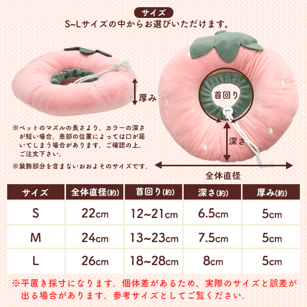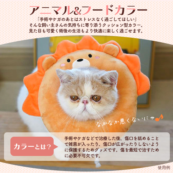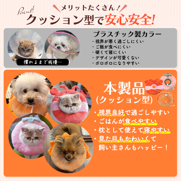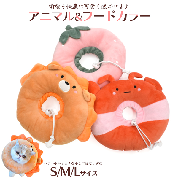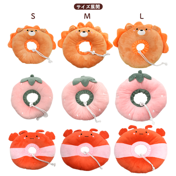 そんな飼い主さんの気持ちに寄り添うクッション型カラー。 見た目も可愛く、術後の生活もより快適に楽しく過ごせます。 プラスチック製に比べて視界が塞がれず、ごはんが食べやすい作りになっています。 ふかふか綿入りで枕としても使用でき、移動時にも音がならず、術後もストレスなく過ごせます。 洗濯ネットに入れて、洗濯機で丸洗いが可能!いつでも清潔に使用できます。 首回りは紐で調整ができ、内側に布が付いているので隙間を作らず、 無理やり手を入れて外してしまう心配もありません。 S、M、Lサイズの3サイズ展開! いちご、ライオン、エビの3種類からお選び頂けます。 | ||||||||||