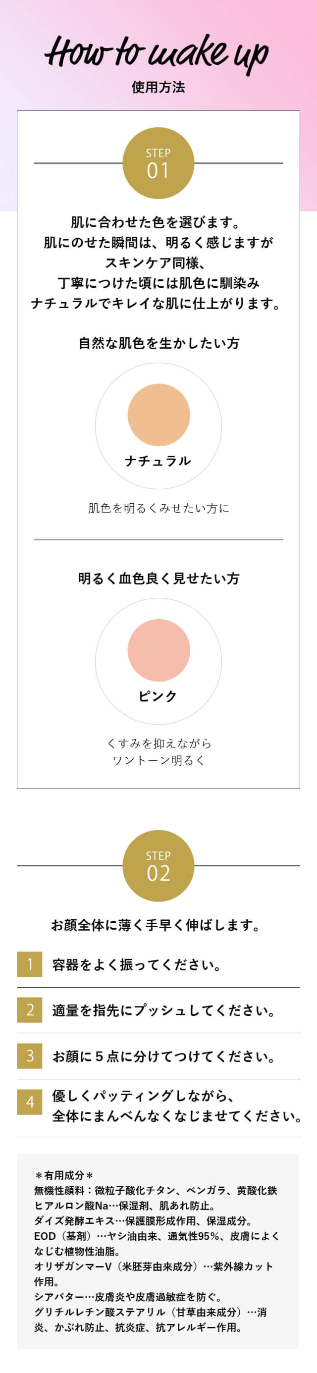 | 表示成分 | 水、シクロペンタシロキサン、ナイロン-12、グリセリン、エタノール、PEG/PPG-20/20ジメチコン、エルカ酸オクチルドデシル、ジエチルヘキサン酸ネオペンチルグリコール、オレイン酸ポリグリセリル-2、ポリブテン、塩化Na、トコフェロール、オリザノール、グリチルレチン酸ステアリル、シア脂、ヒアルロン酸Na、ダイズ発酵エキス、メチルパラベン、エチルパラベン、ブチルパラベン、「+/-」タルク、酸化チタン、酸化鉄、メチコン |