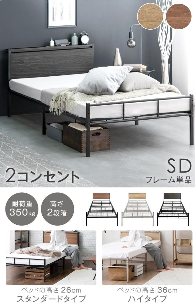 高耐荷重300kg ベッド セミダブル 2コンセント付 2段階高さ調整 宮棚 スチール パイプベッド 単品 セミダブルベッド 宮付き スチールベッド 宮棚 コンセント 頑丈 シンプル 一人暮らし ベッドフレーム セミダブル