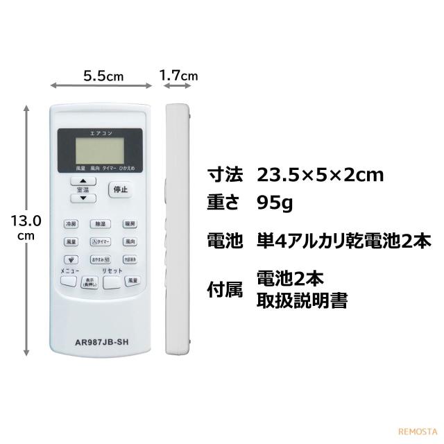 シャープ エアコン リモコン A987JB 電池付き AY-P28N-W AY-P40N-W AY-P40DH2 AY-P56DH2 AY-R22N-W AY-R25N-W AY-R28N AY-R40N-W AY-R40DH2 AY-R56DH2 AY-L56DH2 AY-N22N AY-N25N AY-N28N AY-N40N-W AY-N22TD AY-N25TD AY-N28TD AY-N40TD など HITACHI 代用リモコン REMOSTA
