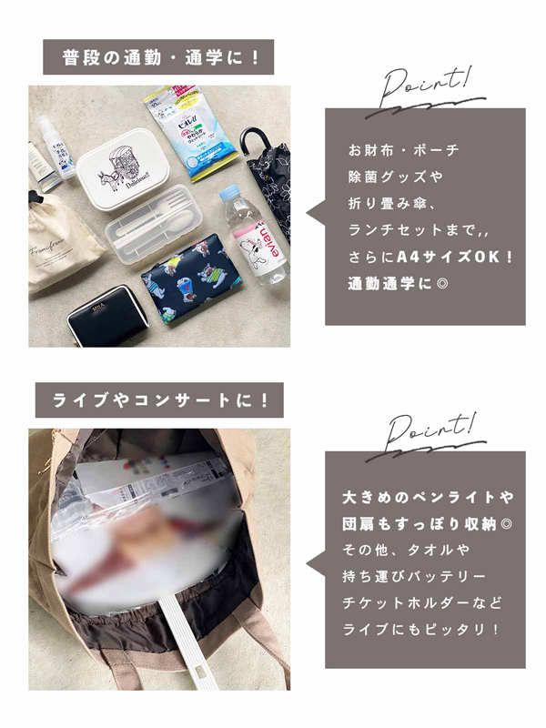 お財布やお弁当、折り畳み傘などを入れて通勤や通学などに使うのはもちろん、