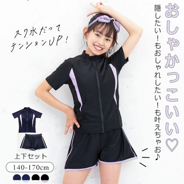 スクール水着 女の子 セパレート ラッシュガード付き かっこいい 前開き キュロット 半袖 脱ぎやすい ぴったりしない インナー付き ジュニア水着 上下 セットアップ スナップ めくれ防止ボタン 女子 スカート 140cm 150cm 160cm 170cm YUK ユック 送料無料