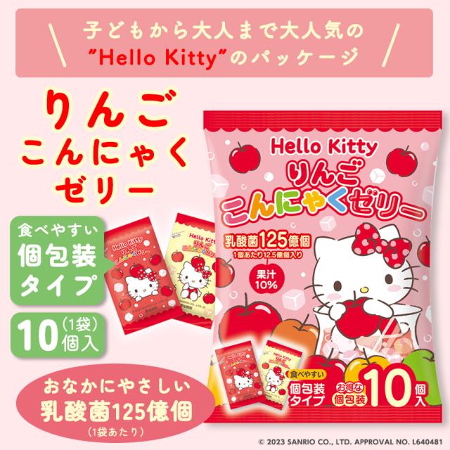 | 子どもから大人まで大人気の「Hello Kitty」のパッケージのりんごこんにゃくゼリー。1袋10個入の個包装タイプで、お子様のおやつや小腹が空いたときなどにもオススメです。1個あたり乳酸菌12.5億個入りでおなかにやさしく手軽に食べられます。 |