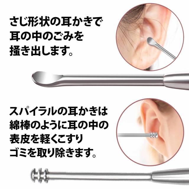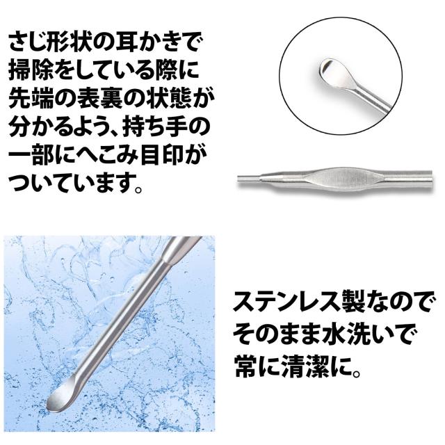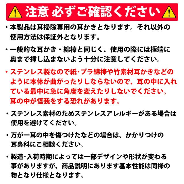 ・ステンレス製なので紙・プラ綿棒や竹素材耳かきなどのように本体が曲がったりしならないので、耳の中に入れている最中に急に角度を変えたりしないでください。耳の中が怪我をする恐れがあります。