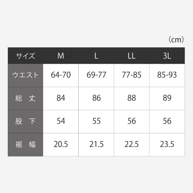 ■サイズ:M/ウエスト64-70、総丈84、股下54、裾幅20.5、L/ウエスト69-77、総丈86、股下55、裾幅21.5、LL/ウエスト77-85、総丈88、股下56、裾幅22.5、3L/ウエスト85-93、総丈89、股下56、裾幅23.5cm
