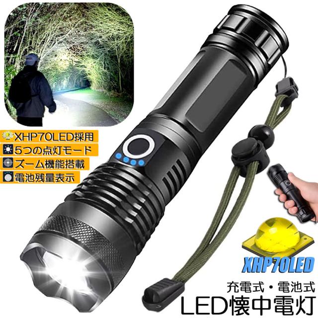 懐中電灯 ledライト XHP70 ハンディライト 5モード調光 強力 防水 USB充電式 電池式 LCD残量表示 ズーム機能 Type-C充電式 ledライト フラッシュライト led sosライト 明るい ハンディライ ト 登山用品 防災 停電対策 夜